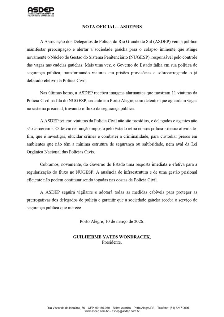 ASDEP denuncia carceragem com viaturas da Polícia Civil no NUGESP.