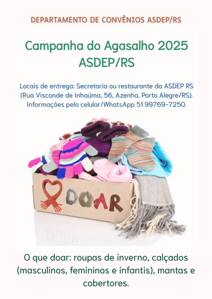 Informamos que hoje, 16/06, iniciamos a Campanha do Agasalho 2025 da ASDEP/RS.As doções podem ser entregues na secretaria ou no restaurante da sede (Rua Visconde de Inhaúma, 56, bairro Azenha, Porto Alegre/RS).Em breve, a ASDEP divulgará a(s) entidade(s) beneficiada(s). Contamos com a solidariedade de todos! Atenciosamente,Grace Vieira Ramos,Diretora do Departamento de Convênios da ASDEP RS.